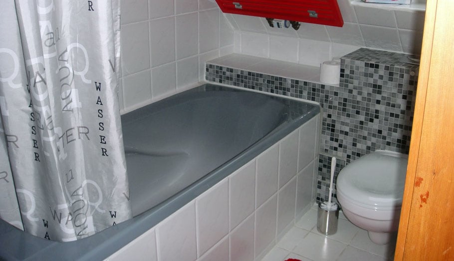 Im modernen, tageshellen Bad befindet sich eine Wanne mit Dusche, ein WC und ein Fön.